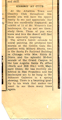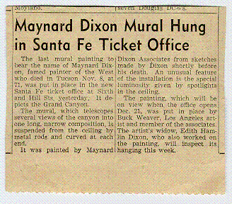 Source Unknown. Undated. "Maynard Dixon Mural Hung in Santa Fe Ticket Office".