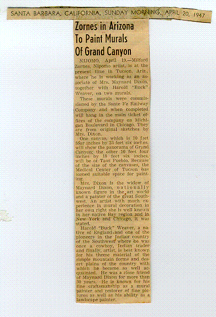 Santa Barbara, California. 20 April 1947. "Zornes in Arizona to Paint Murals of Grand Canyon".